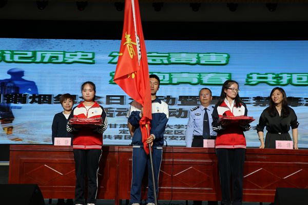 甘肃禁毒网讯 为纪念“6·3”虎门销烟181周年,提高辖区高校学生的识毒、防毒、拒毒意识和能力,充分调动青年志愿者参与禁毒的积极性,6月3日,定西市安定区禁毒委组织相关成员单位联合甘肃中医药大学定西校区,举办了以“铭记历史、勿忘毒害,拥抱青春,共拒毒品”为主题的虎门销烟纪念日活动暨青年禁毒志愿者启动仪式。区委常委、区委政法委书记、区禁毒委常务副主任郎满春出席活动并作禁毒知识讲座,区禁毒办负责人、市公安局安定分局党委委员王瑛,区禁毒办全体人员、甘肃中医药大学定西校区部分师生等共计200余人参加活动。